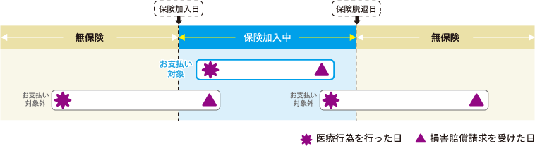 この保険は損害賠償請求ベース(「保険期間中に損害賠償請求がなされること」を保険金支払いの条件とする契約)です。医療上の事故(患者の身体の障害)に対して保険期間中に損害賠償請求がなされた場合に限ります。 - ・この保険の加入日以前に施術した事故につきましては、保険期間中に損害賠償請求がなされた場合でも保険のお支払い対象になりません。